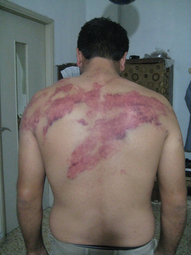 قال أحد الوافدين السوريين إنه تعرض للضرب بقسوة على وجه الخصوص. كان الجنود قد عثروا على حاسب محمول في الغرفة التي يستأجرها مع آخرين، فطلبوا منه تشغيل الحاسب، لكنه قال إنه لا يخصه ولا يعرف كيف يشغله، فشرع الجنود في إلقاء الماء عليه وضربه بعصا خشبية. شاهدت هيومن رايتس ووتش الكدمات على ظهره. تعرض سوري آخر، وهو عامل بناء في الثالثة والأربعين، تعرض للضرب المبرح لدرجة أنه خشي أن يكون أحد ضلوعه قد كسر. قال كل العمال إنهم لا يملكون تكاليف الذهاب إلى طبيب، لكنهم ذهبوا إلى عيادة محلية تابعة للصليب الأحمر، فأعطتهم رذاذاً لرشه على الكدمات.