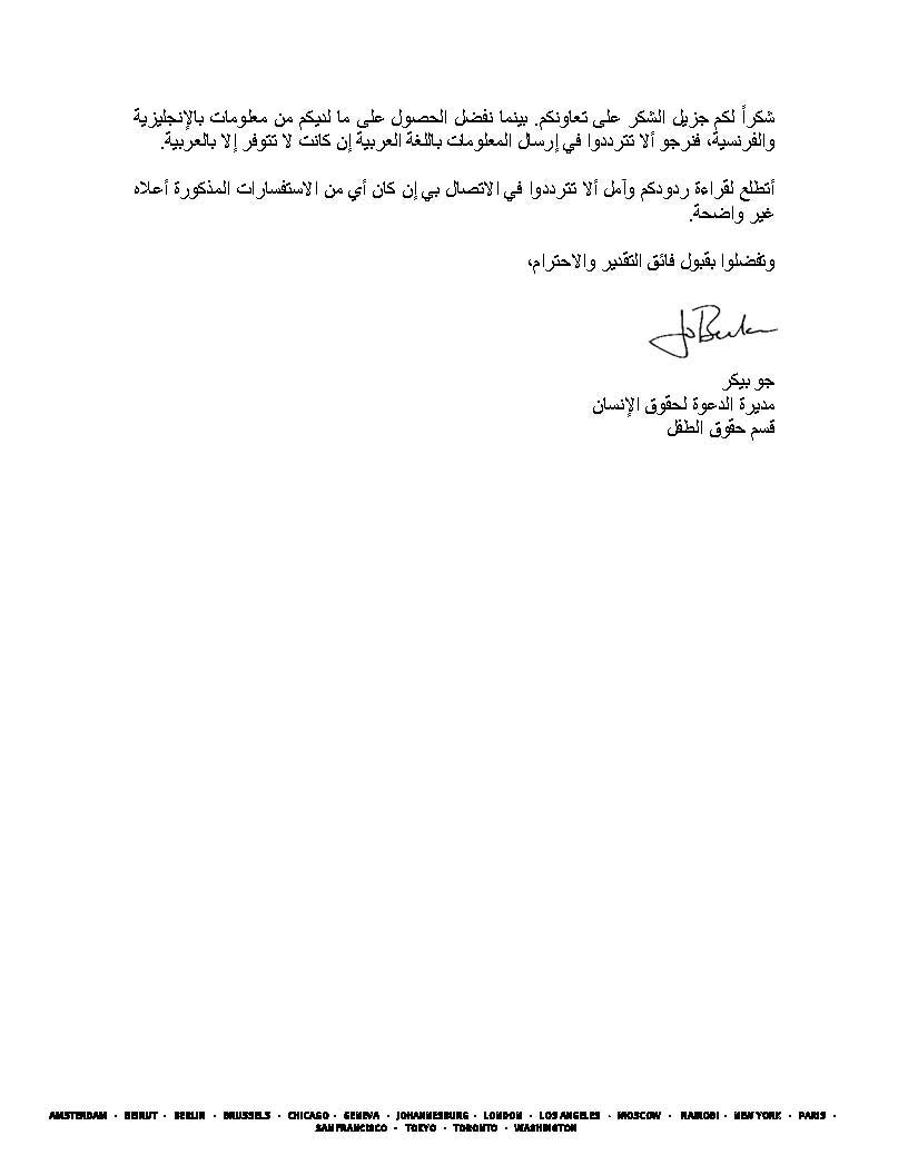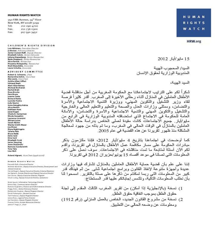 رسالة هيومن رايتس ووتش إلى المندوبية الوزارية لحقوق الإنسان بطلب معلومات إضافية