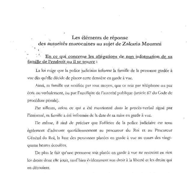 بيان من المندوبية الوزارية لحقوق الإنسان ورد في 28 فبراير/شباط 2012 إن المسمى زكريا مومني كان موضوع مذكر بحث على الصعيد الوطنين، بناء على الشكاية التي تقدم بها إلى النيابة العامة بالرباط السيد عبد الصمد راجي صنهاجي محام بهيأة الرباط لفائدة موكليه مصطفى أشكاط وإدريس السعدي، في مواجهة المعني بالأمرالذي أوهمها أن بإمكانه توفير عقدي عمل لهما بفرنسا أو بإحدى الدول الأوربية مقابل مبلغ قدره 24000 درهم لكل واحد منهما، وقد سلماه بتاريخ 23/01/2010 مبلغ 14000 درهم لكل واحد كدفعة أولى، في انتظار إتمام بقية المبلغ وقت إحضار عقدي العمل، وسلم لهما رقم هاتفه النقال بفرنسا وهو 0033661428342، وبعد مدة اتصلا به بالرقم المذكور فوجداه غير مشغل، آنذاك اتضح لهما أنهما كانا ضحية نصب، وبعد ضبط المشتكى به والاستماع إليه، أكد أنه فعلا استولى على المبالغ المالية المذكورة، لعدم توفره على عمل ومدخول قارين، ولحاجته للإنفاق على نفسه فكر في الحصول على مداخيل ولو بشكل غير مشروع مستغلا رغبة بعض المغاربة في الهجرة إلى الخارج كما تعرف المشتكيان على المعني بالأمر من بين مجموعة من الأشخاص عرضوا عليهما، وبناء على ذلك تمت متابعته من طرف النيابة العامة لدى المحكمة الابتدائية بالرباط من أجل النصب وصدر في حقه حكم بتاريخ 04/01/2010 قضى بمؤاخذته من أجل ما نسب إليه والحكم عليه بثلاث سنوات حبسا نافذا وغرامة نافذة قدرها 500 درهم، تم استئنافه من طرف المشتكي، وفتح للقضية ملف جنحي استئنافي عدد 3792/10/19 قضى بتأييد الحكم الابتدائي مع تخفيض العقوبة إلى سنتين ونصف حبسا نافذا، تم الطعن فيه بالنقض من طرف المحكوم عليه، وأصدر المجلس الأعلى قرارا قضى بالنقض والإحالة على محكمة الاستئناف بالرباط، وبعد إحالة القضية على المحكمة فتح لها ملف عدد 3610/11/19 وبجلسة 15/12/2011 حضر المتهم مؤازرا بدفاعه والشاهدين (المشتكيين) مصطفى واشكاط وإدريس السعدي، وبعد أدائهم اليمين القانونية أمام المحكمة أكدا معا كافة تصريحاتهما الواردة بمحضر الضابطة القضائية، وبتاريخ 22/12/2011 أصدرت المحكمة قرار قضى برفض السراح المؤقت وبتأييد الحكم الابتدائي مع تعديله بتخفيض العقوبة الحبسية المحكوم بها ابتدائيا إلى عشرين شهرا حبسا نافذا، والقرار المذكور لم يكن محل طعن بالنقض من طرف النيابة العامة. والجدير بالإشارة أن المعني بالأمر تم الإفراج عنه بعد استفادته من العفو الملكي الصادر بتاريخ 05 فبراير/شباط 2012 بمناسبة ذكرى المولد النبوي الشريف. بيان حول قضية زكريا المومني المرسلة من قبل وزارة الخارجية ورد في 26 مايو/أيار 2011 [يبدأ هذا البيان بموجز عن القضية، والذي حذفناه لأنه صيغة سابقة من بيان أعيد نشره أعلاه، وورد في 28 فبراير/شباط 2012، عن المندوبية الوزارية لحقوق الإنسان. ويسترسل البيان]