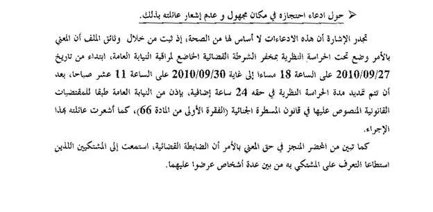 في الواقع، وفقا لمحاضر الشرطة الموجودة في ملف القضية، أطلع ما لا يقل عن 17 متهما قاضي التحقيق في أول جلسة جوهرية أمامه إنهم قد تعرضوا للتعذيب؛ وقال كثير منهم إنهم أجبروا على التوقيع على تصريحات للشرطة دون قراءتها. طلبنا في رسالتنا عبر البريد الإلكتروني: في هذه القضية، أليس قاضي التحقيق هو الذي أجرى التحقيق، وليس الوكيل العام للملك؟ إذا كان الأمر كذلك، فإن المحاضرتشير إلى أن معظم المتهمين أثاروا التعذيب في هذه المرحلة. فماذا يقصد ممثل النيابة العامة عندما جادل بأن المتهمين قد فشلوا في إثارة مزاعم التعذيب أمام قاضي التحقيق - - ولماذا يبدوا الكتاب الأبيض متبنيا لهذا الادعاء؟