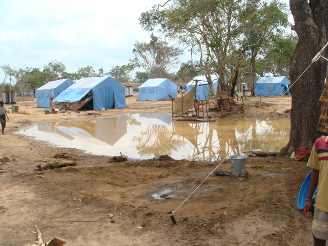 During the last several days, heavy rain fell on northern Sri Lanka, flooding several camps. Zones 2 and 4 of Manik farm, a large complex of camps west of the town of Vavuniya, were particularly affected by rain. More rain is expected with the onset of the rainy season next month, further worsening conditions in the overcrowded camps.