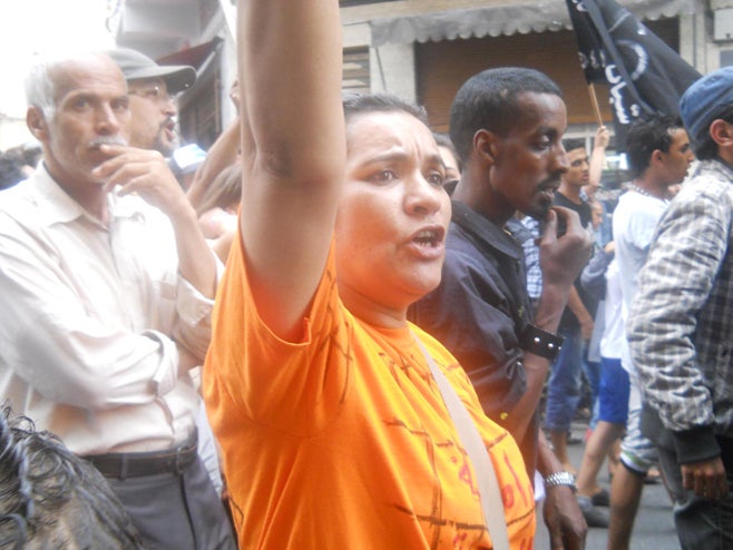 La manifestation était déjà finie, il y avait encore des gens mais ils commençaient à partir. J’étais attablée à un café quand j’ai vu la police s’approcher, donc je me suis levée pour voir ce qu’il se passait. Les policiers m’ont attrapée et enfermée au fond de leur fourgon. Dans le fourgon, des policiers ont tout de suite commencé à me frapper. À chaque fois qu’on ajoutait quelqu’un dans le fourgon, ils recommençaient à frapper tous ceux qui étaient dedans. Ils nous ont emmenés au poste d’Anassi de la police judiciaire de Sidi Bernoussi. Dans le poste, ils ne m’ont pas battue, mais j’ai vu ce qu’ils faisaient aux autres dans les couloirs, avant qu’ils ne nous emmènent dans des bureaux différents: ils les giflaient, leur baissaient le pantalon, les obligeaient à crier « Vive le roi ! » [un des slogans du 20-Février est « Vive le peuple »]. S’ils refusaient, ils les frappaient encore.