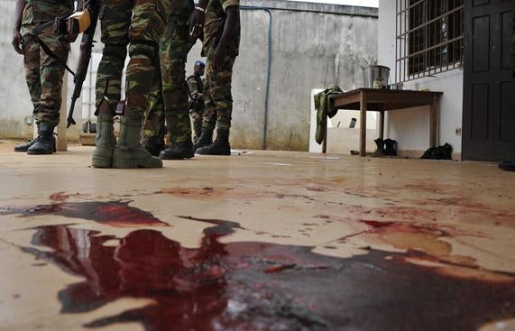 Le sol de la base militaire d’Akouédo est maculé de sang suite à un raid, le 6 août 2012, au cours duquel six soldats ivoiriens ont été tués. Des militants pro-Gbagbo sont soupçonnés d’avoir mené l’attaque, avec l’aide de soldats à l’intérieur du camp. © SIA KAMBOU/AFP/GettyImages