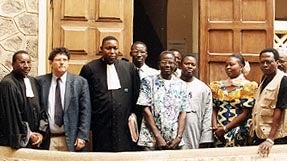 Les plaignants tchadiens, leurs supporters et leurs avocats sénégalais au tribunal de Dakar, après avoir témoigné contre Hissène Habré janvier 2000.