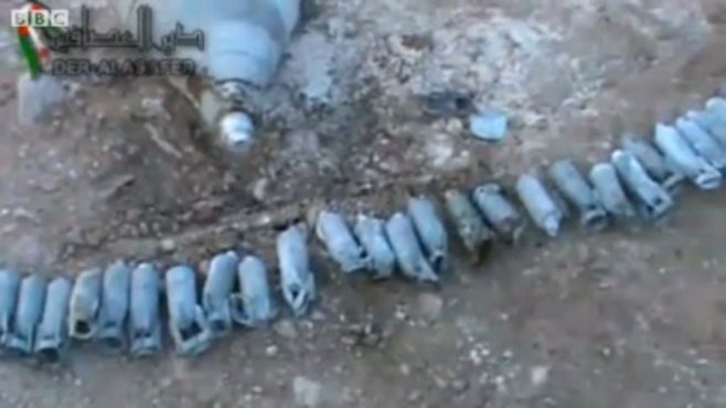 Video footage posted by Syrian activists of the immediate aftermath of the attack shows children and adults lying severely wounded on the ground, with injuries consistent with those caused by cluster bombs.