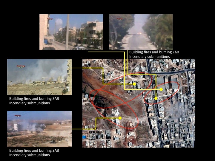 Based on the account of a witness, the first documented use of an incendiary weapon occurred on November 16. An activist in the Damascus suburb of Daraya, which had been heavily bombarded by Syrian forces in recent weeks, told Human Rights Watch that he filmed several videos showing ZAB incendiary submunitions being dropped on Daraya: