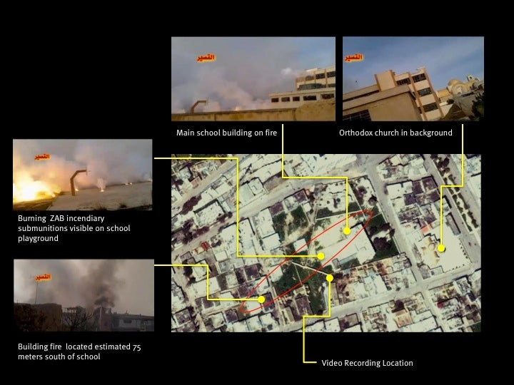 According to the activist, there was no activity by the armed opposition group, the Free Syrian Army, in the school, a single-story building. A second activist from Qusair confirmed to Human Rights Watch that at least 19 civilians were injured in the strike, and at least eight homes were severely burned by the incendiary submunitions.