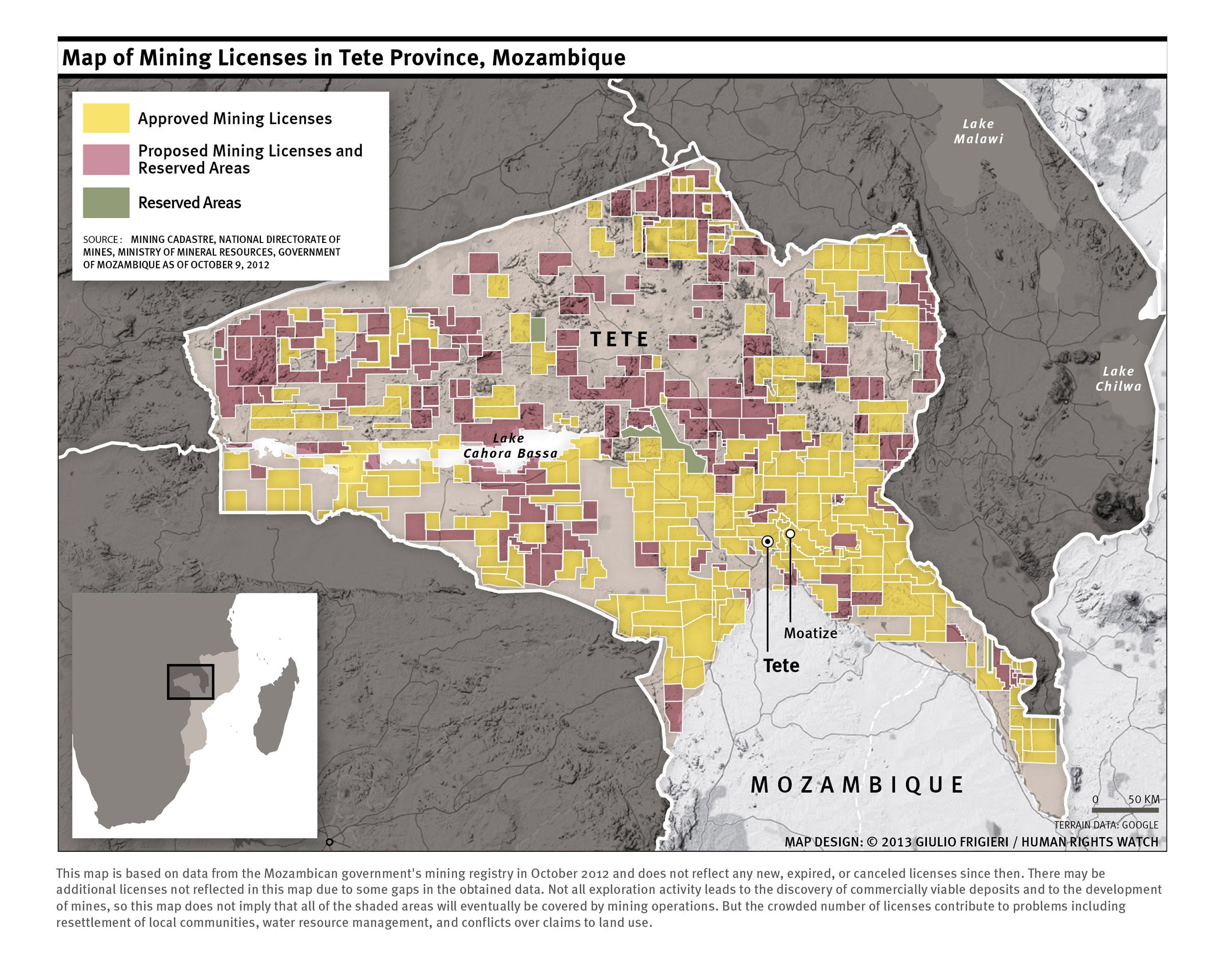 Tete province has an estimated 23 billion tons of mostly untapped coal reserves and is at the early stages of an enormous natural resource boom. According to 2012 government data, approved mining concessions and exploration licenses cover approximately 3.4 million hectares, or 34 percent of Tete province’s area. Coal mining accounts for roughly one-third of these.