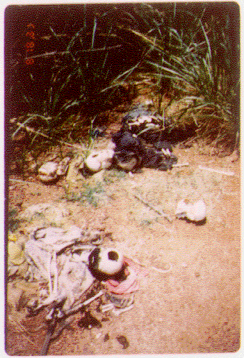 We disinfected bodies in this area for about a week. Right here, there were eight in all, where the refugees had been camped. Some of them are gone now; I think animals may have taken away some of the bones. The bodies all had knife wounds.
