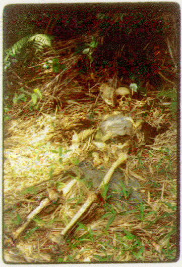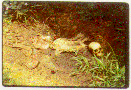 At a bridge just past the second village, the remains of several campfires were still visible, with bones and skulls scattered in the brush nearby. As many as an additional fifty refugees had been killed at this site; bodies had been thrown into the river.(42)