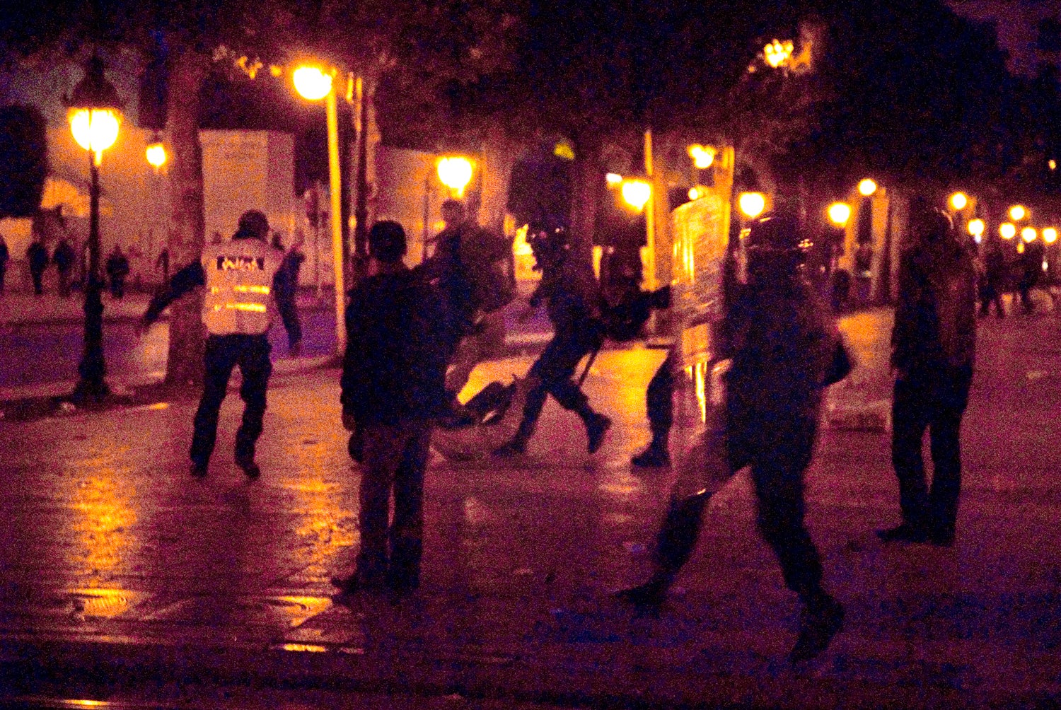 一小时后,法国自由摄影师Michel Monteaux在这条大街的行人街道上拍到穿着制服的警察追捕一名青年,青年倒在地上后还直向他拳打脚踢。Monteaux对人权观察说,警察一发现到他拍照就冲向他,一边用棍子击打他的腿,一边抢过相机,还把相机给砸坏。当时为法国周刊La Vie摄影的Monteaux,后来取回了存有刚拍摄的照片的记忆卡,包括以上照片。