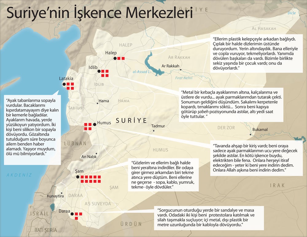 Bu şehirlerdeki işkence merkezlerinin uydu görüntülerini derinlemesine görmek için tıklayınız: Şam, Humus, İdlip, Halep, Dera ve Lazkiye.