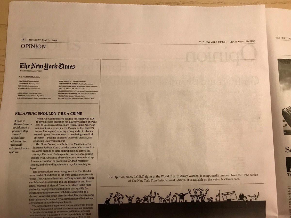 مقال رأي كتبته مينكي ووردن حول حقوق مجتمع الميم في "كأس العالم" أزيل من النسخة القطرية لـ "نيويورك تايمز".