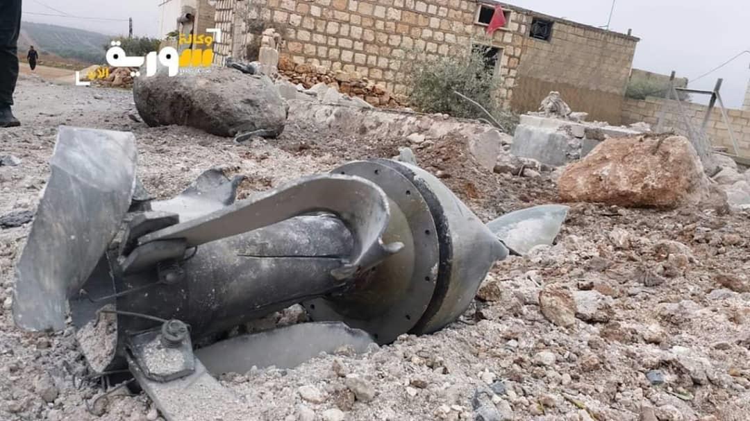 صورة التقطتها مجموعة إعلامية معارضة للحكومة لبقايا قذيفة هاون عيار 240 ميليمتر استخدمت في هجوم شنته القوات الحكومية على جرجناز وأوقع قتلى، في 24 نوفمبر/تشرين الثاني 2018.