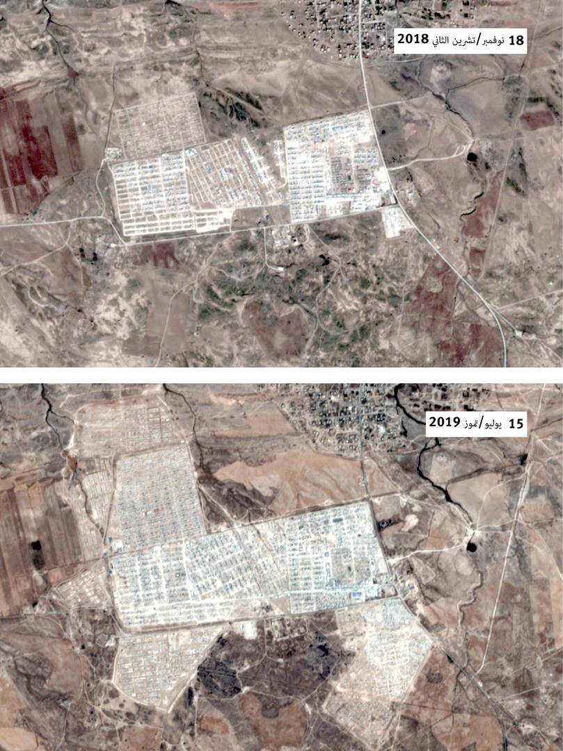 توسّع مخيم الهول في شمال شرق سوريا بسرعة مع وصول أكثر من 63 ألف امرأة وطفل نزحوا بسبب الهجوم على تنظيم "الدولة الإسلامية (داعش) في الباغوز بين ديسمبر/كانون الأول 2018 وأبريل/نيسان 2019. يظهر الملحق في الجزء الأسفل إلى اليمين، وهو يضم اليوم أكثر من 11 ألف أجنبي غير عراقي.
