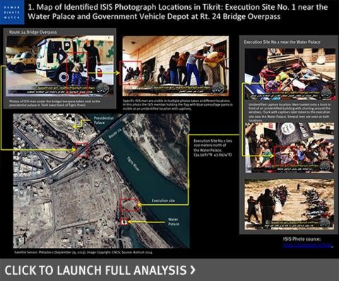رسمت هيومن رايتس ووتش، باستخدام صور القمر الصناعي، خريطة مسرح الجريمة. كشفت الصور الجوية والأرضية عن 5 مواقع للإعدام في مجمع القصور الرئاسية في تكريت، حيث قتل مقاتلو داعش ما بين 560 و770 رجل. روى أحد الناجين بالتفصيل كيف احتُجز وتظاهر بالموت، ثم هرب. حذرنا في ذلك الوقت من احتمال ارتفاع عدد القتلى.