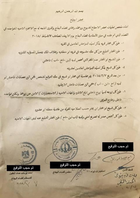 لكن محضر اجتماع فبراير/شباط ينص على ما يلي: "على الشيخ أو المختار عدم الختم لأي شخص لديه [إبن، أو أخ، أو أب] داعشي.... يتم محاسبة أي مختار أو شيخ في حالة التوقيع لشخص ينتمي إلى عصابات داعش أو لديه [أخ، ابن، أو أب] منتمي إلى عصابات داعش الإرهابية.... على كل شخص صدر له تصريح أمني ولديه [أب، ابن، أو أخ عضو في التنظيم] على المختار التبليغ عنه لدى الجهات الأمنية".