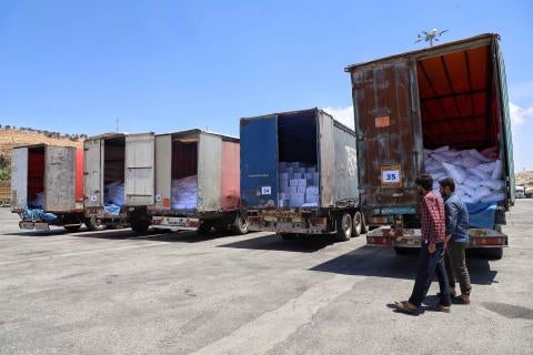 حتى نهاية مارس/آذار، كان 75% من أصل أربعة ملايين شخص في شمال غرب سوريا يعتمدون على المساعدات لتلبية احتياجاتهم الأساسية و85% منهم يتلقونها عبر حوالي ألف شاحنة تعبر الحدود كل شهر من تركيا، وفقا للأمم المتحدة. تُظهر وثيقة أممية حصلت عليها هيومن رايتس ووتش أن هذا يشمل المساعدات الأساسية مثل الغذاء والإمدادات الطبية ومواد الإيواء، التي توزعها الأمم المتحدة ووكالات غير تابعة لها في جميع أنحاء المنطقة.