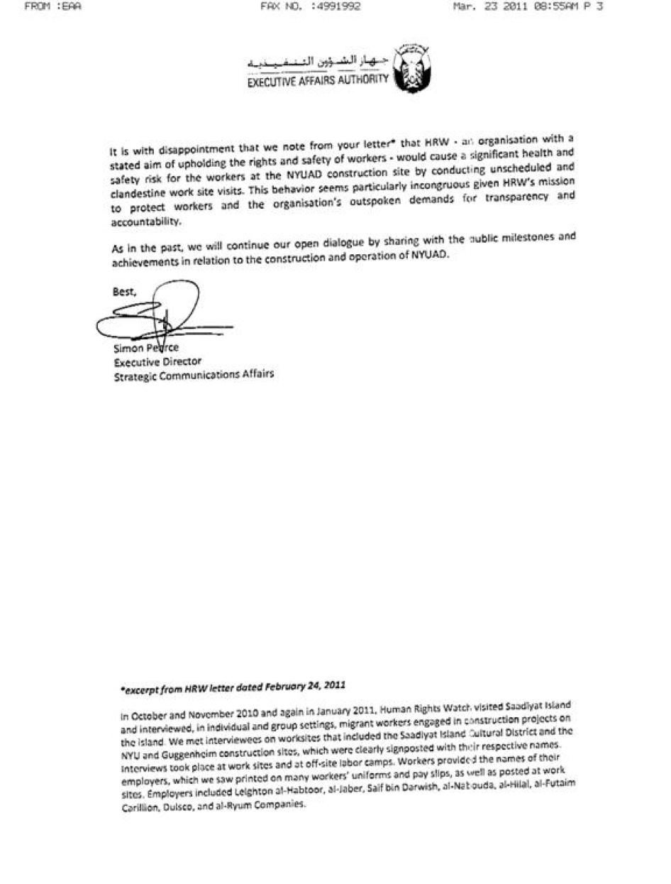 في فبراير/شباط 2011 عرضت هيومن رايتس ووتش أحدث ما توصلت إليه من نتائج في رسالة لم تُنشر (وهي منشورة في ملحق هذا التقرير) أرسلتها إلى الأطراف الأساسية في مشروع تطوير جزيرة السعديات، ومنها شركة التطوير والاستثمار السياحي، وجهاز الشؤون التنفيذية لأبو ظبي، وجامعة نيويورك وغوغنهايم ووكالة المتاحف الفرنسية، وعقدت اجتماعات مع جامعة نيويورك وغوغنهايم واللوفر، وألقت الضوء على استمرار الانتهاكات في الجزيرة، وشددت مرة أخرى على الحاجة للمراقبة المستقلة والتعويض والإنصاف الحقيقيين للعمال الذين يسيئ إليهم أصحاب عملهم ومكاتب الاستقدام. بينما ردت جميع المؤسسات على النتائج الواردة في خطابنا، فإن ردودهم تباينت بشدة من حيث المعلومات التي وفروها، واستعدادهم للإقرار بانتهاكات حقوق الإنسان والتصدي لها، تلك التي تسببت فيها ممارسات العمل المتبعة بشكل عام في الإمارات. ولقد أكدت جميع المؤسسات على الأقل على التزام عام بحماية حقوق العمال في مواقع الإنشاءات الخاصة بكل منهم.[4]