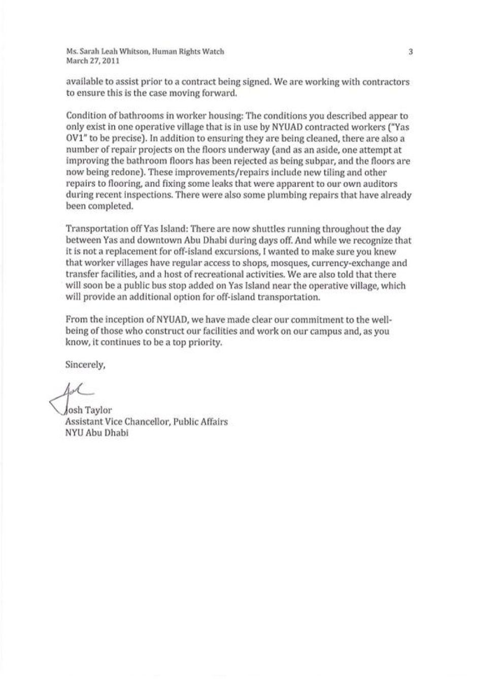 ورغم استمرار جامعة نيويورك في الصمت بشأن هذه الوعود الأولى، فقد أقرت الجامعة بالحاجة لضمان تلقي العمال للمعلومات الكاملة عن عملهم قبل توقيع العقود. رد الجامعة على هيومن رايتس ووتش ورد فيه أن: "لابد أن تتوفر العقود دائماً بالإنجليزية والعربية (كما ورد في نص القانون الإماراتي)، وأن بالإضافة إلى ذلك، لابد من توفر مترجمين للمعاونة قبل توقيع العقد. نحن نتواصل مع المقاولين لضمان حدوث هذا من الآن فصاعدا". [25]