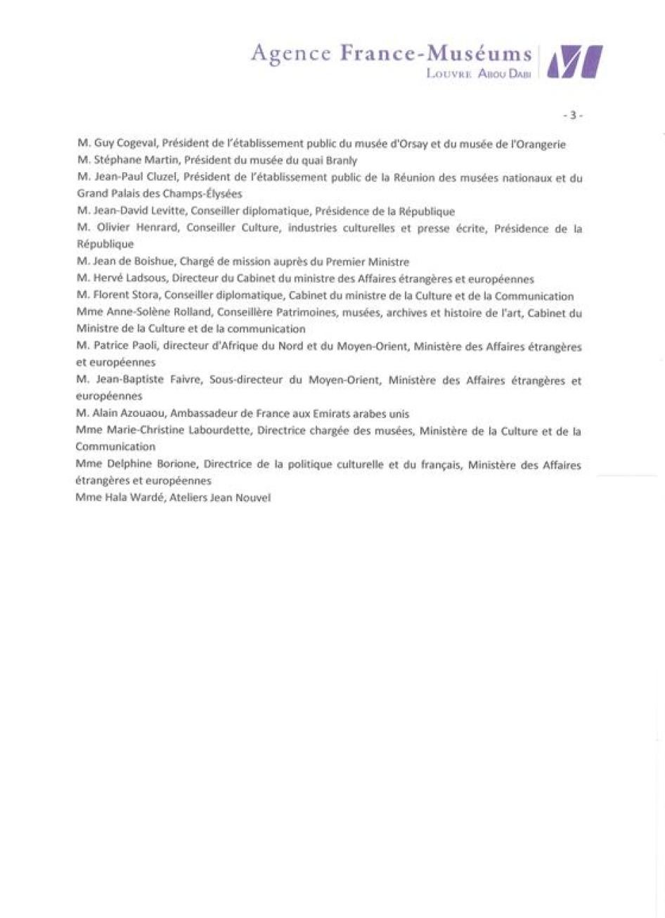 على النقيض، فإن وكالة المتاحف الفرنسية واللوفر، لم تعلن حتى الآن عن منهجها للتعامل مع الحقوق الإنسانية للعمال الوافدين الذين يشيدون فرع المتحف، رغم أن الوكالة تقدمت ببعض التفسيرات غير المعلنة رداً على بعض بواعث القلق التي أثيرت. في مراسلات واجتماعات مع هيومن رايتس ووتش، تحدثت الوكالة وإدارة المتحف عن التزام الحكومة الفرنسية التاريخي بحماية حقوق العمال، وشددوا على أن القضايا الواردة في تقريرنا الصادر عام 2009 ما زالت مثار قلق لهم. كما أوضحوا أن الالتزامات التعاقدية بين وكالة المتاحف الفرنسية وشركة التطوير والاستثمار السياحي تشمل مطلب (يسبق صدور تقريرنا عام 2009) بأن تفي ظروف العمال في مشروع اللوفر-أبو ظبي بالمعايير الدولية للعمال كما وردت في معيار المحاسبة الاجتماعية 8000 (المعروف باسم SA8000 )، وهو مجموعة قواعد لإرشاد الشركات للالتزام بحقوق العمال المعترف بها دولياً. بينما تعتبر الإشارة إلى قواعد SA 8000 في العقد خطوة هامة نحو ضمان معاملة العمال بشكل عادل مع الالتزام بالقانون الدولي لحقوق الإنسان، فما زال من غير الواضح كيف سيتم تطبيق هذه المادة في العقد على أرض الواقع. قال مسؤولون من اللوفر في مناقشات مع هيومن رايتس ووتش إنهم سيعتمدون على نتائج مُراقب أوضاع العمل الذي ستعينه شركة التطوير والاستثمار السياحي لمراقبة أوضاع العمل في متحف اللوفر، وأيضاً أوضحوا أن الأحكام التعاقدية غير مرتبطة بضمانات إنفاذ تسمح بوضوح لوكالة المتاحف الفرنسية باتخاذ إجراءات معينة إذا تنامى إلى علمها مخالفة المعايير المتفق عليها.