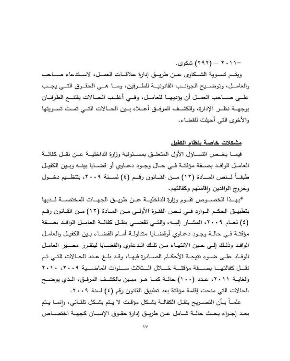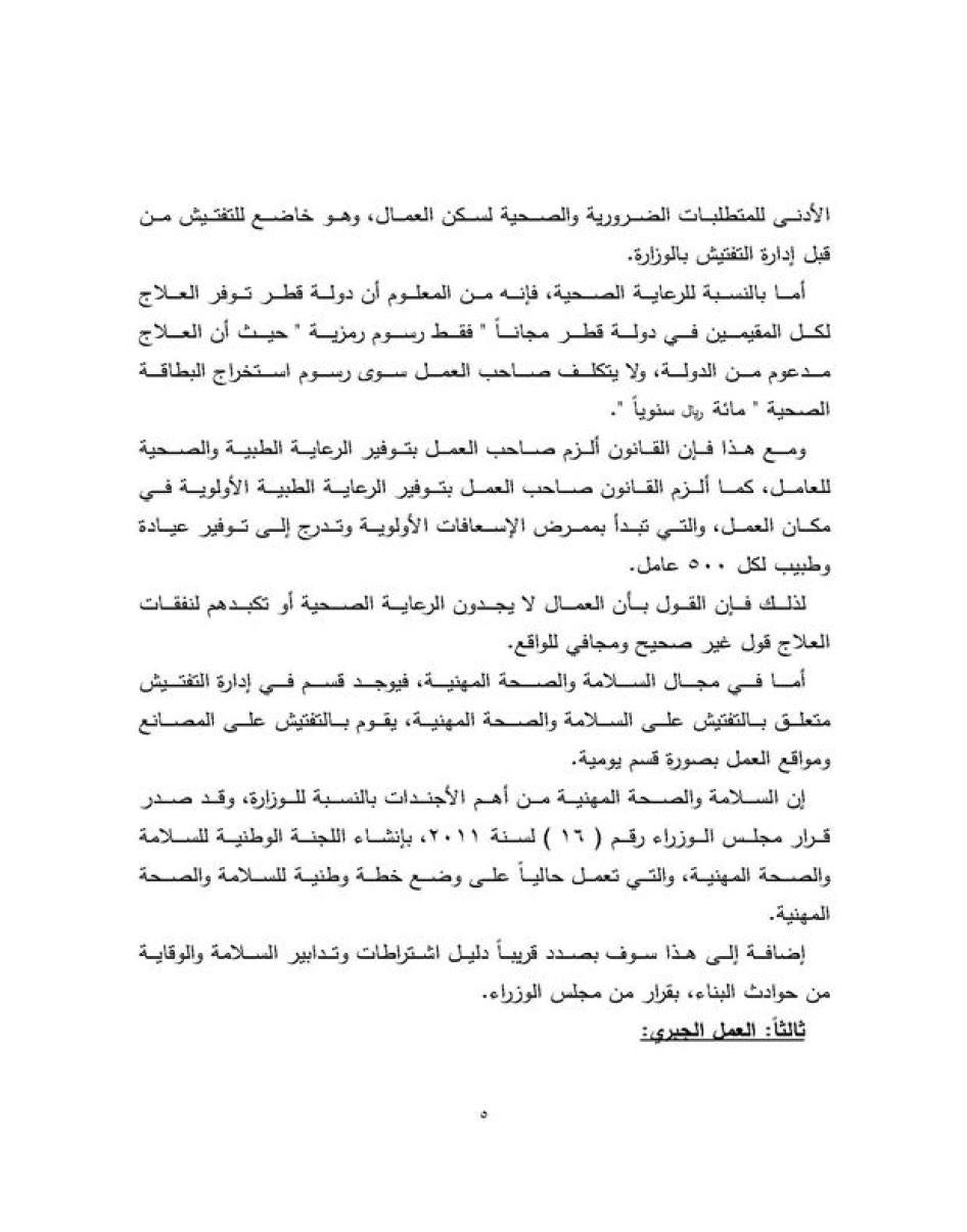 [172] رسالة من وزارة العمل القطرية، 1 نوفمبر/تشرين الثاني 2011، ص 11.