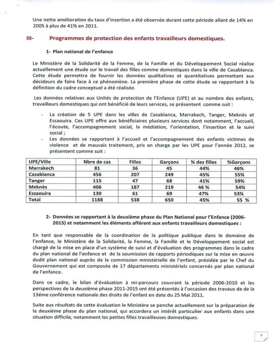 وهيأت الحكومة في خمس مدن وحدات لحماية الأطفال لمساعدة من يقعون ضحايا للعنف أو سوء المعاملة، وقد يشمل ذلك عاملات منازل قاصرات قمن بالفرار من أصحاب عمل مسيئين. وأنشأت وزارة التشغيل والتكوين المهني وحدة مركزية لعمل الأطفال وأعدت نقاط خاصة بعمل الأطفال في 43 مفتشية عمل، وقامت بالتعاون مع منظمة العمل الدولية واليونسيف، بتدريب مفتشي عمل ومسؤولين حكوميين آخرين على تطبيق قوانين عمل الأطفال. في عام 2010 صدر قرار حكومي بزيادة أنواع الشغل التي تعتبر خطيرة مع حظرها بالنسبة للأطفال تحت 18 عاماً. يحظر القرار بعض المهام المتعلقة بعمل الأطفال في الخدمة المنزلية، لكنه لا يحظر تحديداً قيام الأطفال بالعمل المنزلي.