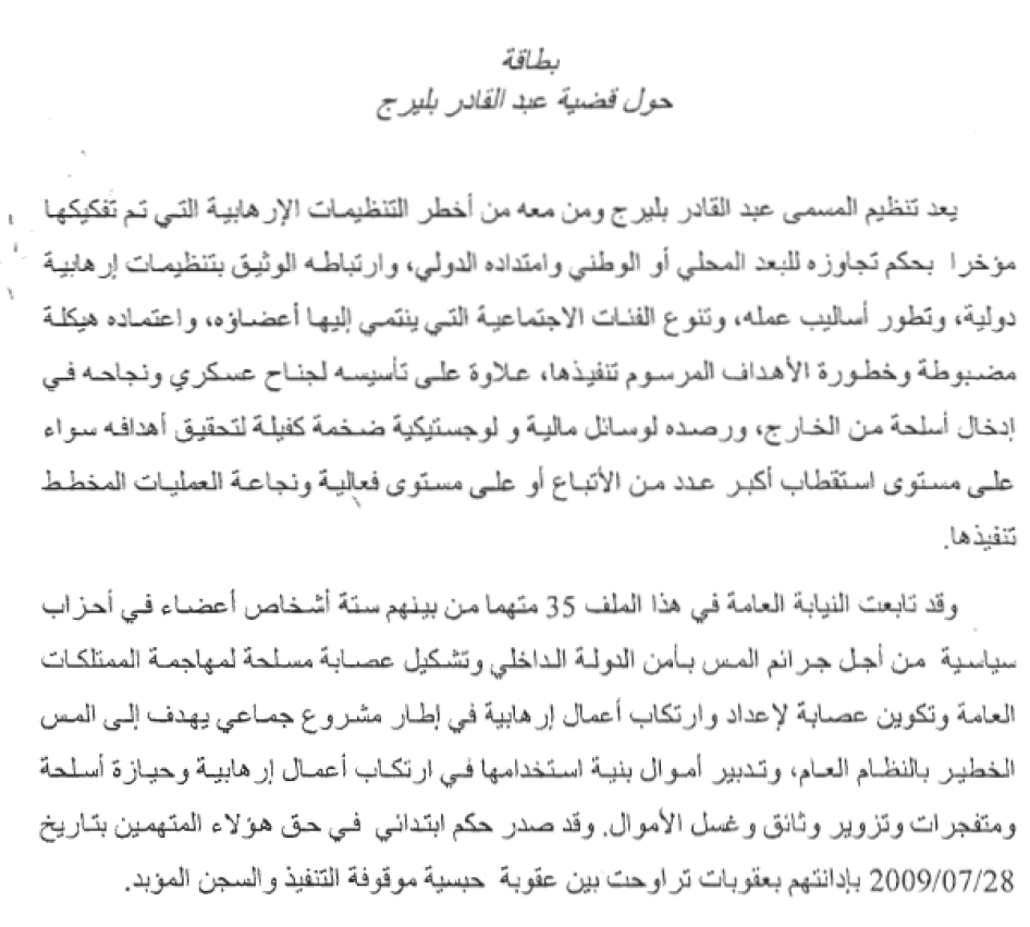 - 35 متهما اعتقلوا في عام 2008 واتهموا بالانتماء إلى خلية إرهابية، والمعروفة باسم قضية "بلعيرج"، وهو اسم عائلي لواحد من المتهمين الرائدين؛