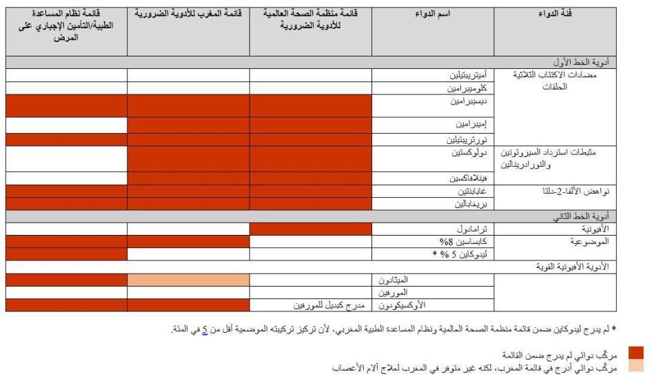 - إدراج جميع الأدوية المخففة للآلام، من كل فئات أدوية علاج آلام الأعصاب التي أوصى بها فريق الاهتمام الخاص بآلام الأعصاب، التابع للرابطة الدولية لدراسة الألم، في قوائم الأدوية الأساسية في المغرب ونظام المساعدة والتأمين الإجباري.