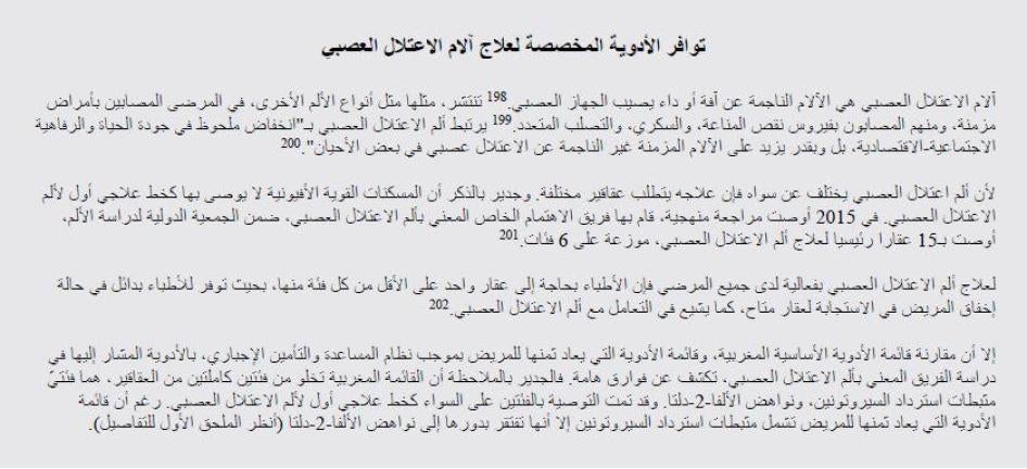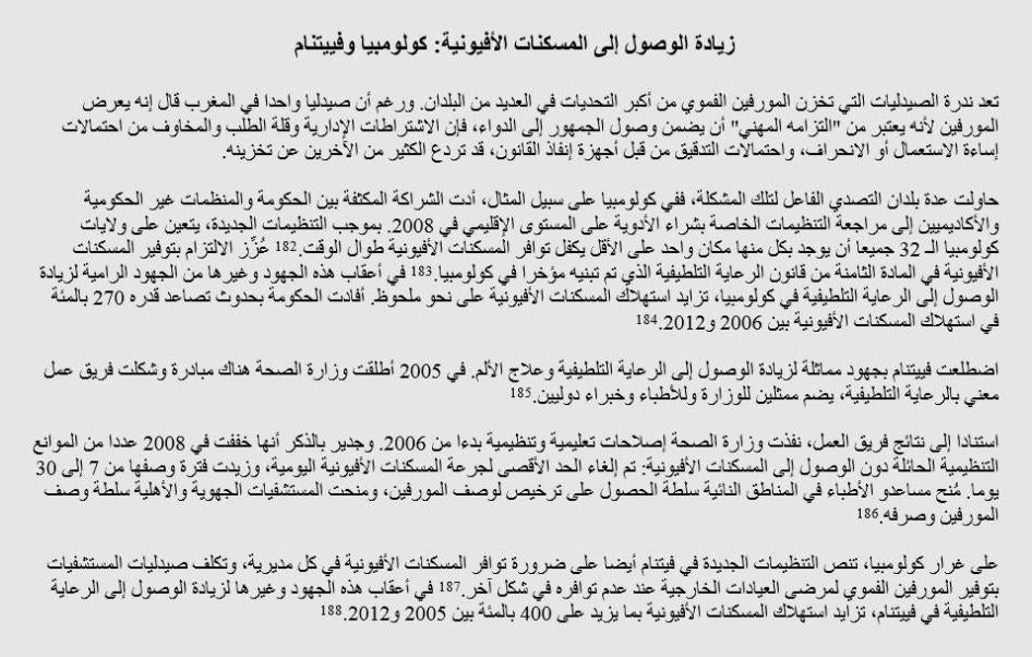 - ضمان توافر المسكنات الأفيونية خارج المدن الكبرى. على الحكومة أن تضمن أن كل منطقة في المغرب لديها صيدليات توفر المسكنات الأفيونية. وفي المناطق التي لا يتوفر فيها ذلك، على صيدليات المستشفيات أن توفر هذه الأدوية لمرضى العيادات الخارجية.