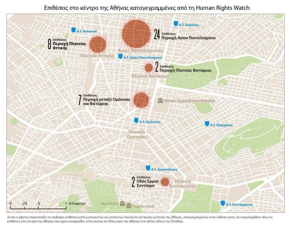 Η έξαρση της βίας κατά των μεταναστών προκάλεσε σοβαρές ανησυχίες. Ωστόσο, οι επιθέσεις σε βάρος μεταναστών και αιτούντων άσυλο είχαν ξεκινήσει πολύ πριν από τον Μάιο του 2011 και, έκτοτε, συνεχίζονται με τρομακτική συχνότητα τόσο στην Αθήνα όσο και σε άλλες περιοχές της Ελλάδας. Μετανάστες και αιτούντες άσυλο μίλησαν στη Human Rights Watch για περιοχές της Αθήνας που αποτελούν πραγματικό άβατο μετά τη δύση του ηλίου λόγω του φόβου επιθέσεων από ομάδες, συχνά μαυροντυμένων, Ελλήνων με βίαιες διαθέσεις. Ο Yunus Mohammadi, πρόεδρος της αφγανικής κοινότητας στην Ελλάδα, μας είπε ότι έχει αρχίσει να δείχνει σε νεοαφιχθέντες μετανάστες έναν χάρτη των Αθηνών, όπου σημειώνονται με κόκκινο οι περιοχές τις οποίες θα πρέπει να αποφεύγουν. «Αυτό ακριβώς έκανα στο Αφγανιστάν με τον Ερυθρό Σταυρό για τις περιοχές εκείνες που έπρεπε να αποφεύγει κανείς λόγω των εχθροπραξιών», δήλωσε ο Mohammadi. «Και ορίστε που κάνω το ίδιο σε μια ευρωπαϊκή χώρα».