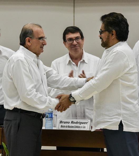 The head of the Colombian government delegation to the peace talks, Humberto de la Calle, left, and the head of the FARC-EP delegation Ivan Marquez, right, shake hands after the signing of the agreement on victims of the conflict at Convention Palace in Havana, on December 15, 2015.