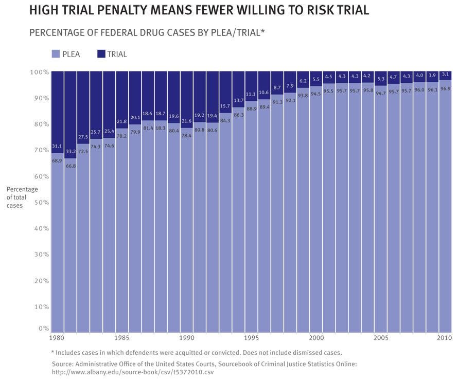 Los acuerdos entre la defensa y la parte acusadora son ampliamente aceptados en gran parte bajo el supuesto pragmático de que si cada caso penal fuese a juicio, el sistema de justicia se sobrecargaría hasta quedar paralizado. La Corte Suprema de EE.UU. ha aceptado esta lógica en fallos que autorizan estos acuerdos con la fiscalía. Sin embargo, principios de derechos humanos, y principios fundamentales de la justicia penal de EE.UU., establecen que las sentencias penales no deberían ser más largas de lo necesario para proteger al público y asegurar que los delincuentes rindan cuentas.