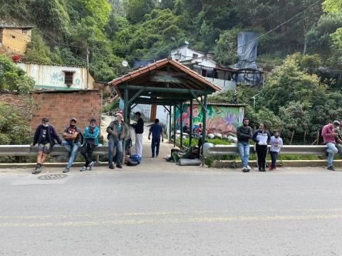 Caminantes venezolanos esperando al costado de una carretera en Colombia, noviembre de 2021. © 2021 Tamara Taraciuk/Human Rights Watch.