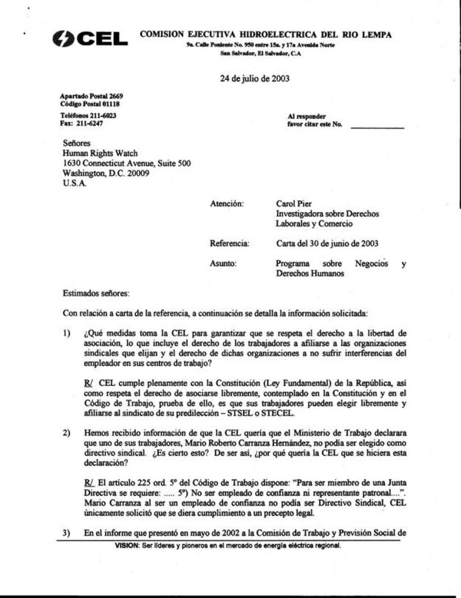 [480] Entrevista realizada por Human Rights Watch, Ernesto Gómez, abogado laboral, San Salvador, 3 de febrero de 2003.