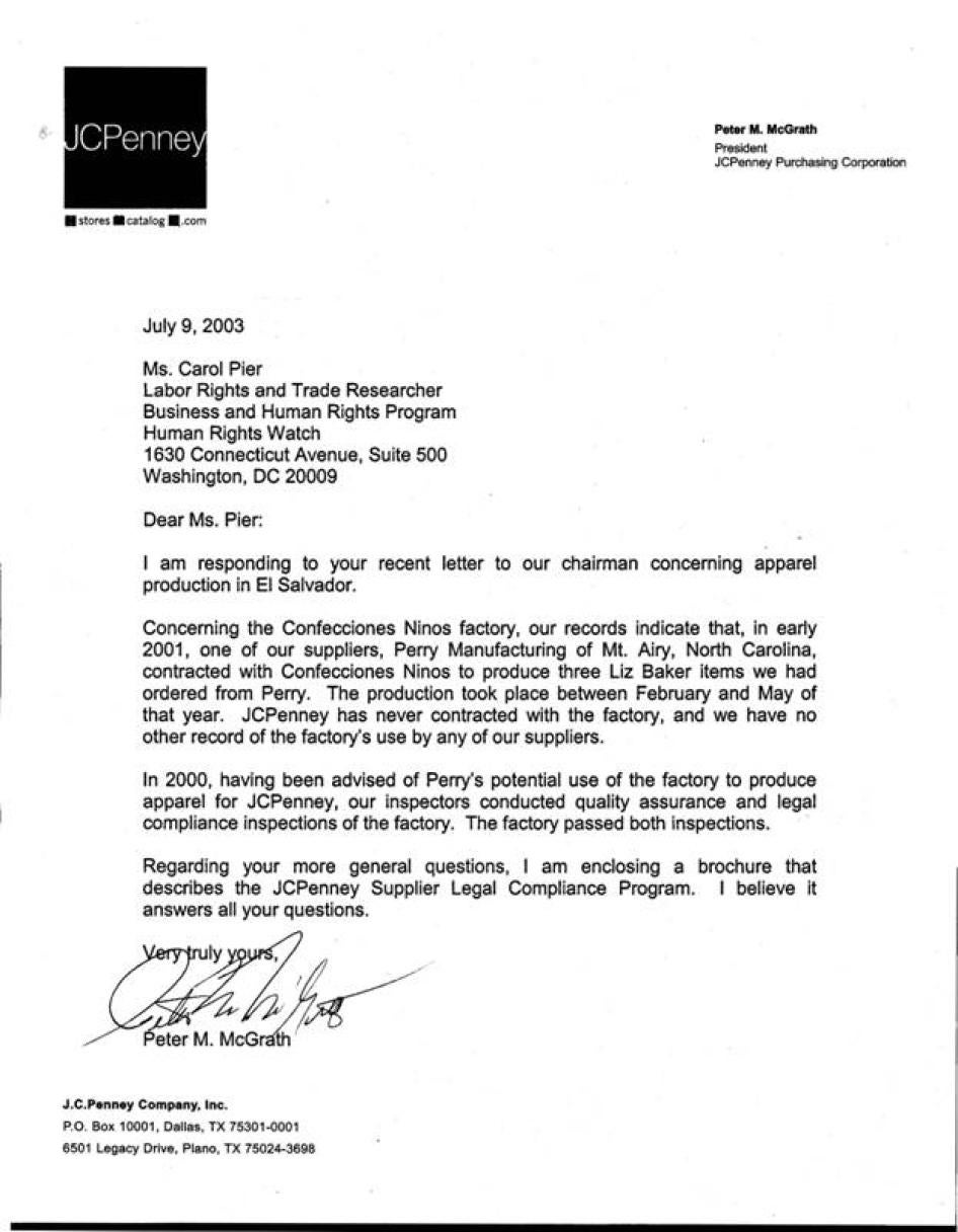 [416]Carta de Peter M. McGrath, presidente, JC Penney Purchasing Corporation, dirigida a Human Rights Watch, 9 de julio de 2003.