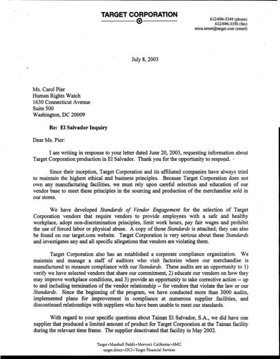 [430] Carta de Erica C. Street, presidente, Target Brands, Inc., dirigida a Human Rights Watch, 8 de julio de 2003.