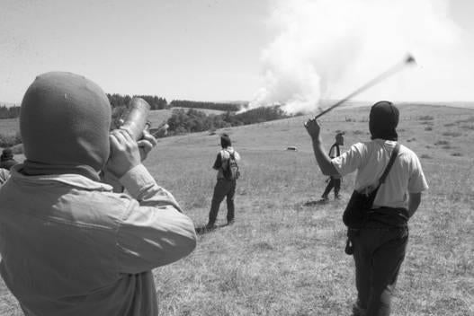 Mapuche enfrentando a la policía con Wetruves (Boleadores) en el fundo El Carmen del Forestal Bosques Arauco, comuna de Temuco. Febrero 13 de 2001.