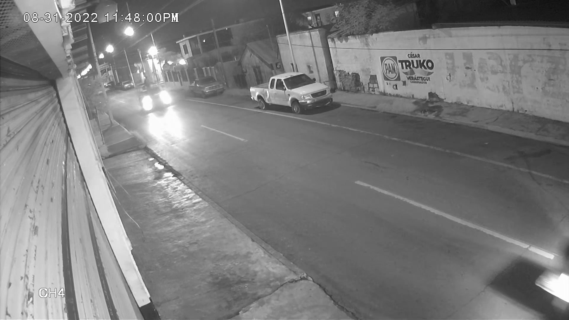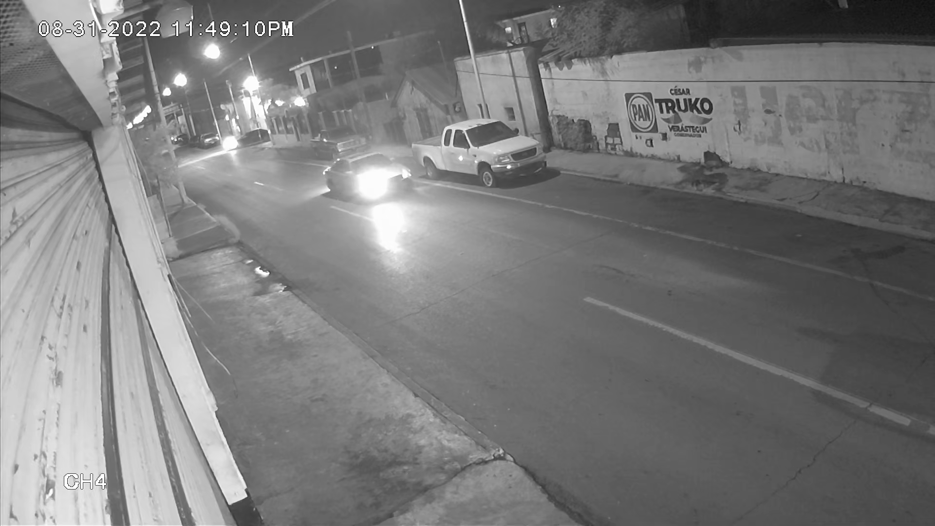 Immediately afterwards, a convoy of two pickup trucks with machine guns mounted on a turret in their bed and one armored vehicle can be seen driving west to east on Calle González, away from the location of the reported traffic accident and toward the security camera. The vehicles stop in front of the security camera, and soldiers in one of the pickups shine their flashlights at it before moving off the screen. A minute later, light, seemingly from a flashlight off camera, appears to turn around traffic on the street.