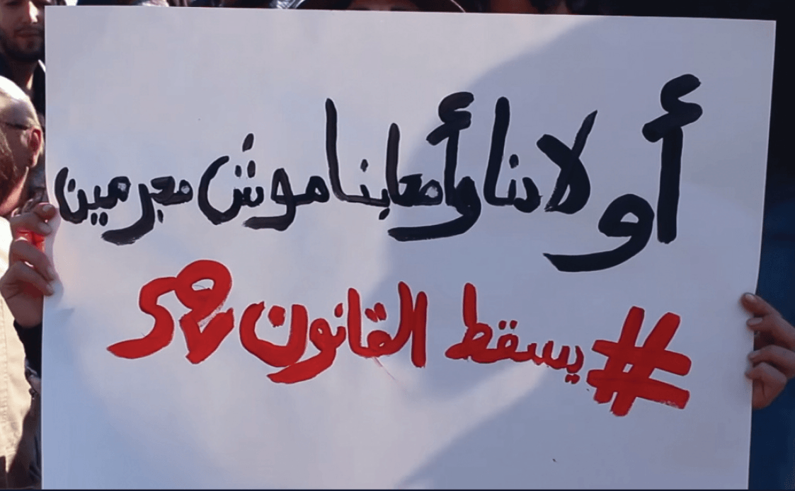 Manifestation en faveur de l’abrogation de la Loi 52 sur la drogue, tenue le 28 décembre 2015 devant le Palais du Bardo à Tunis, où siège le Parlement tunisien. La bannière comporte le message : « Nos enfants et nos amis ne sont pas des criminels ».
