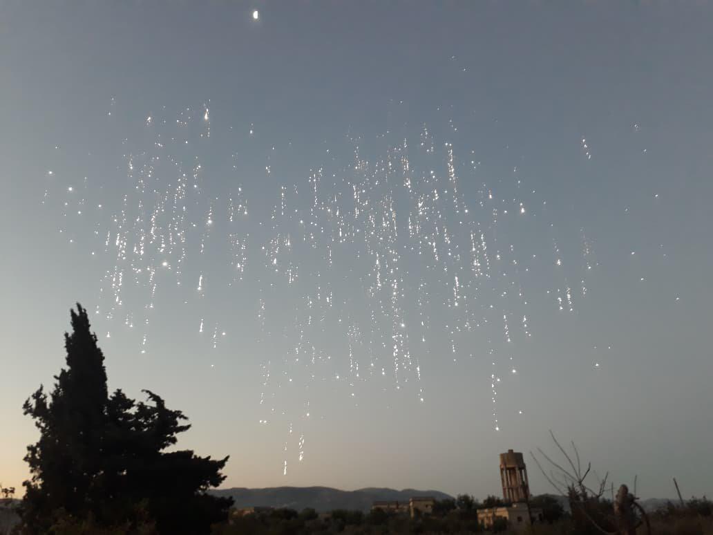 Traces blanches dans le ciel manifestement causées par le recours à un type d’arme incendiaire à Bdama, dans la région d’Idlib en Syrie, en juillet 2018.
