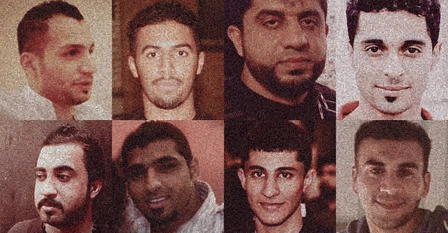 Huit détenus bahreïniens condamnés à mort suite à des procès inéquitables, selon un rapport publié conjointement en 2022 par Human Rights Watch et l'Institut bahreïnien pour les droits et la démocratie. EN HAUT, de gauche à droite : Maher Abbas al-Khabbaz, Sayed Ahmed al-Abar, Zuhair Ebrahim Jasim Abdullah, et Husain Ebrahim Ali Husain Marzooq. EN BAS, de gauche à droite : Husain Moosa, Mohamed Ramadhan, Husain Ali Mehdi, et Salmane Isa Ali Salmane.