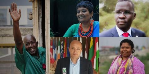 Cinq lauréats du Prix Alison Des Forges décerné en 2015 et en 2016. À gauche, Pierre Claver Mbonimpa (Burundi, 2016). Rangée du haut : Ratnaboli Ray (Inde, 2016), Nicholas Opiyo (Ouganda, 2015). Rangée du bas : Yonous Muhammadi (Grèce, 2016), Kalpona Akter (Bangladesh, 2016). © 2014 Teddy Mazina, Byloom, Ilan. © 2016 Shariful Islam Sourav, Yonous Muhammadi