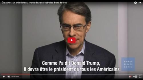 « Suite à sa victoire électorale, le président élu Donald Trump devrait abandonner les discours haineux qui ont fait les gros titres, et gouverner en respectant toutes les personnes qui vivent aux États-Unis », a déclaré Kenneth Roth, directeur exécutif de Human Rights Watch. « Trump a accédé à la Maison Blanche par le biais d’une campagne marquée par la misogynie, le racisme et la xénophobie, mais ce n'est pas la voie à suivre pour bien gouverner. Le président élu Trump devrait s'engager à diriger les États-Unis d'une manière qui respecte pleinement les droits humains et en assure la promotion. »