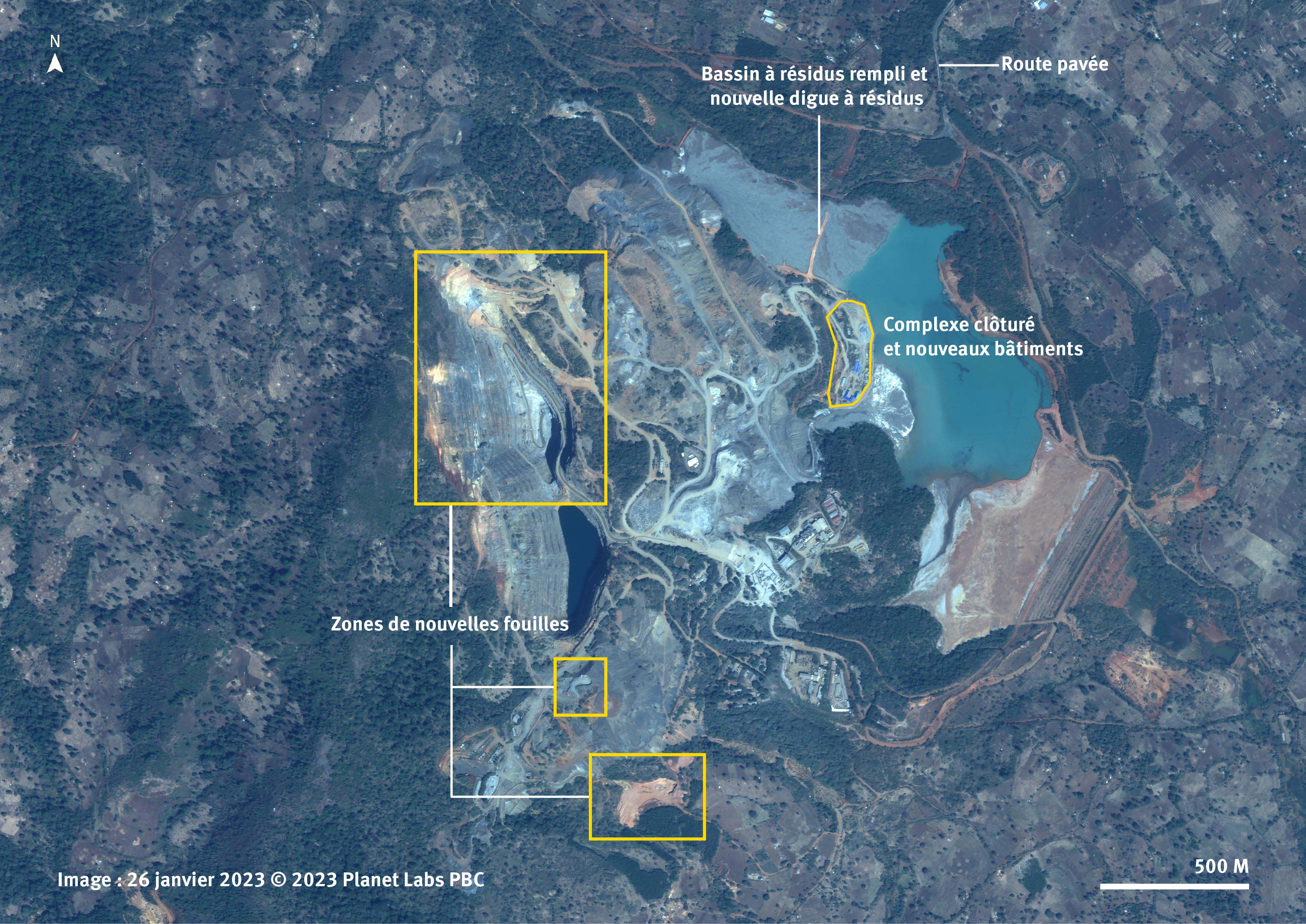 Des informations de sources locales, d’autres déjà publiques et des images satellite recueillies par Human Rights Watch confirment que la mine est actuellement en opération. Elle a rouvert aux alentours de mars 2021, bien que Human Rights Watch n’ait pas été en mesure de déterminer exactement à quelle date. Les sources locales, les images satellite et les données ouvertes au public n’indiquent pas que l'entreprise a pris des mesures pour remédier à la pollution, telles que reconstruire les bassins de déchets.