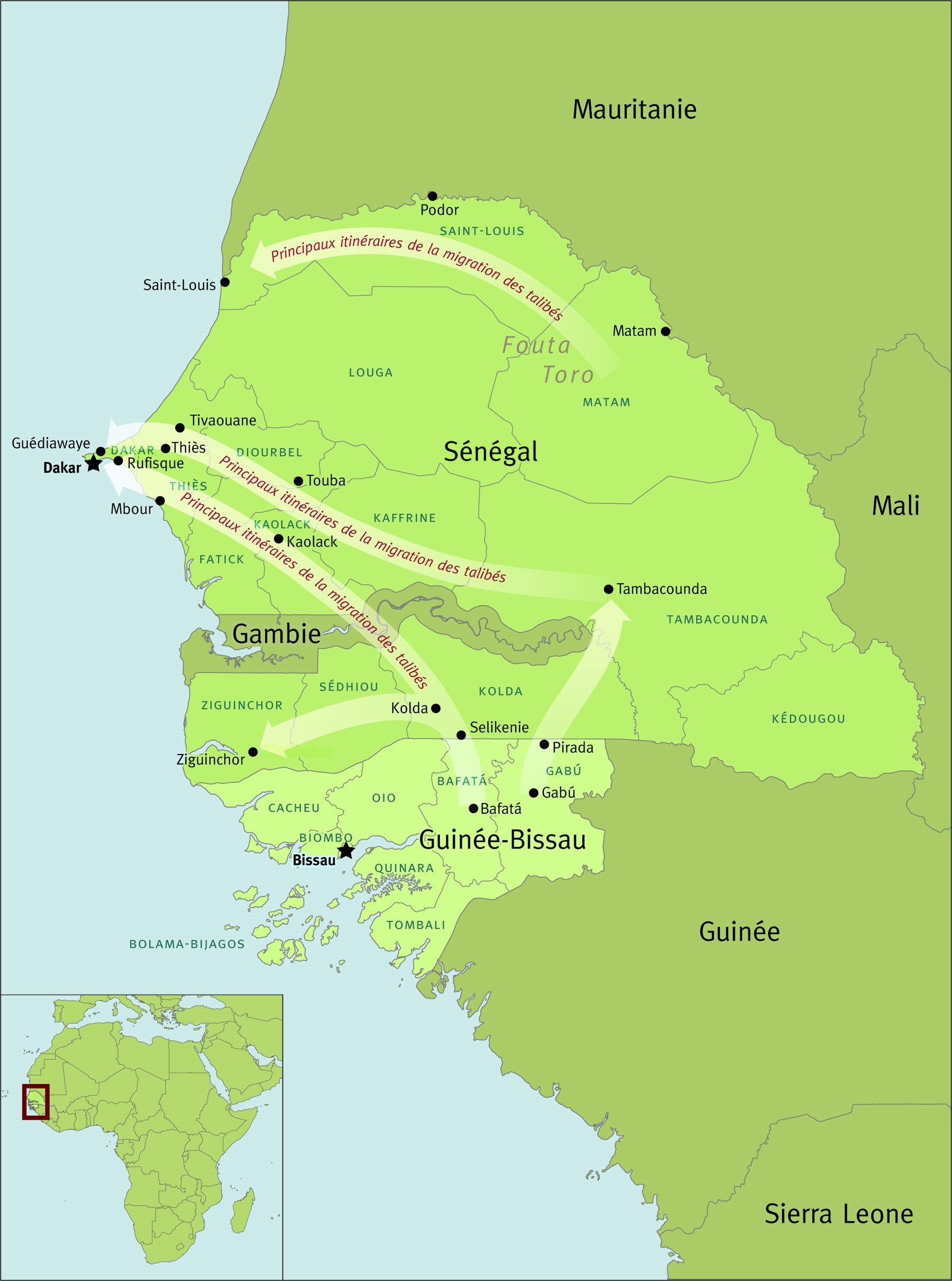 Des milliers d’enfants des régions du Sénégal et des pays voisins, dont la Guinée-Bissau, la Gambie et la Guinée, sont régulièrement envoyés dans des daaras des grandes villes du Sénégal. Enracinée dans la tradition culturelle de « confiage » très répandue en Afrique de l’Ouest – tradition qui consiste à confier son enfant à un autre adulte pour qu’il l’élève – le système des daaras, combiné à la surpopulation, la pauvreté et l’importance accordée à l’apprentissage du Coran, est désormais profondément ancré dans la société. Les maîtres coraniques, responsables de dizaines voire de centaines de garçons talibés, leur servent officieusement de gardiens et emmènent souvent les enfants à des centaines de kilomètres de chez eux. Les filles étudient aussi dans les daaras, mais dans une bien moindre mesure. La majorité des étudiantes coraniques ne mendient pas et ne vivent pas dans les daaras.