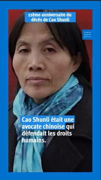 Cao Shunli était une avocate chinoise qui défendait courageusement les droits humains. Il y a 11 ans, le 14 mars 2014, elle est décédée après six mois de détention par les autorités chinoises. Le gouvernement devrait enfin révéler les circonstances précises de son décès.