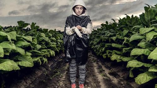 Une adolescente de 16 ans, portant ses vêtements de travail, dans un champ de tabac en Caroline du Nord : « Dans les champs, c’est comme quand j’avais 12 ans. J’ai toujours mal à la tête, et mal au ventre. Et j’ai comme des nausées… J’ai l’estomac qui se retourne, comme si j’allais vomir. »