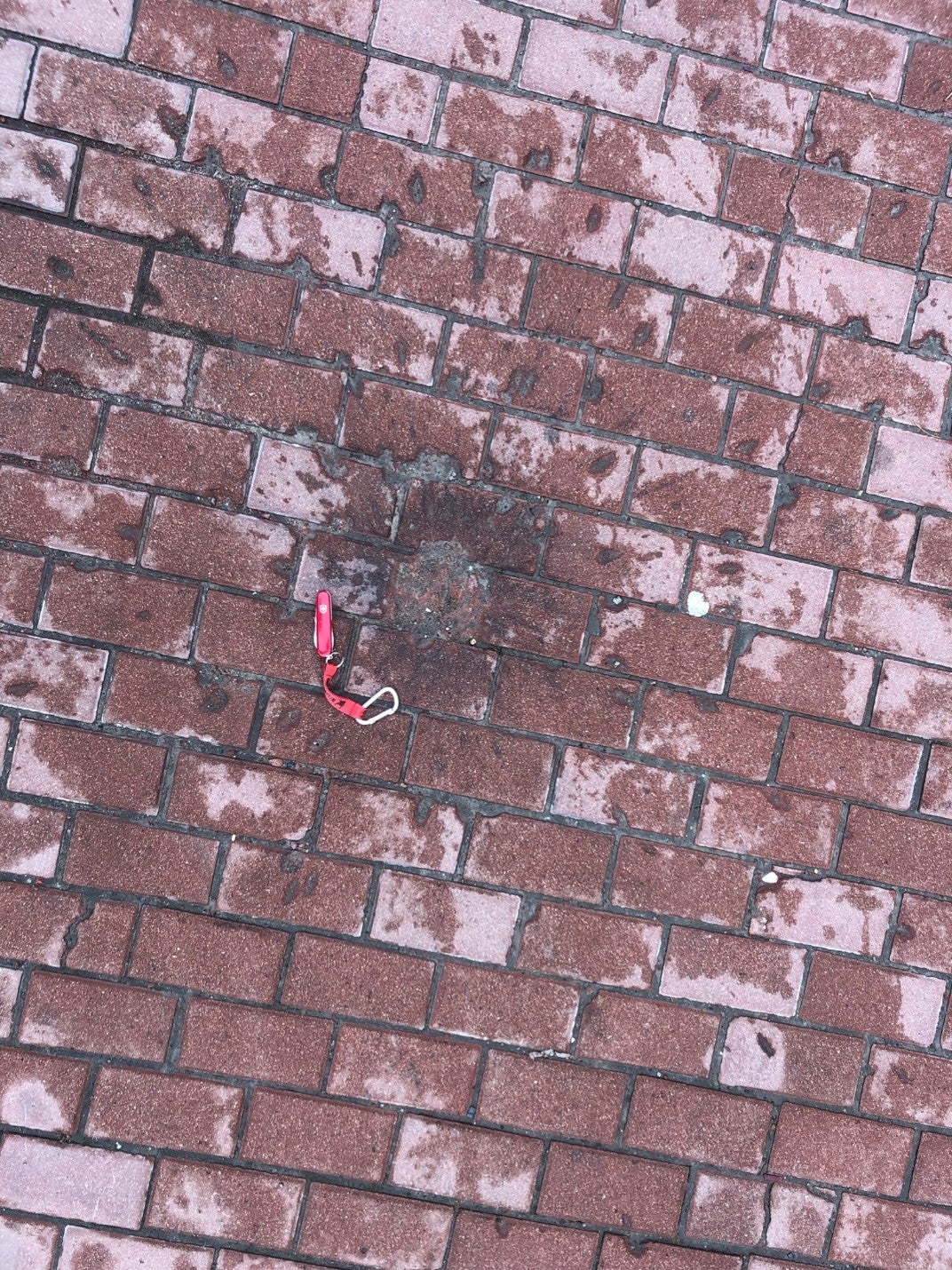 A csernyihivi Regionális Gyermekkórház előtti járdán lévő fröccsminta, mely összhangban van egy 9N235-ös szilánkos lövedék felrobbantásával, egy 2022. március 17-i orosz támadást követően, 2022. április 19.