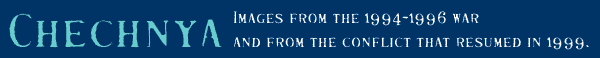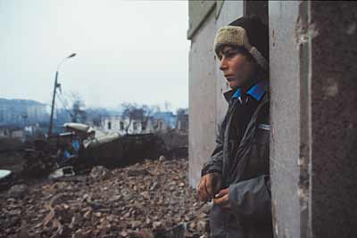 A young boy looks on as Chechen fighters battle Russian forces in Grozny. Chechnya, 1995.